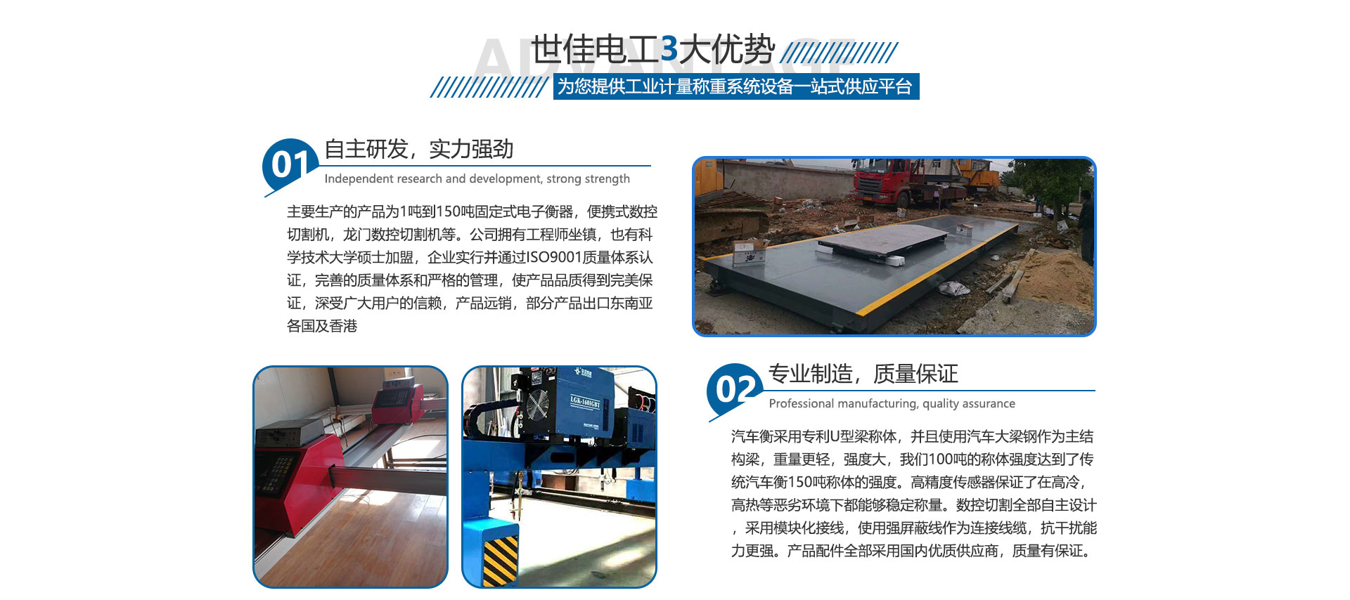 關(guān)于我們合肥世佳電工設(shè)備有限公司是生產(chǎn)、銷(xiāo)售工業(yè)自動(dòng)化設(shè)備。主要生產(chǎn)的產(chǎn)品為1噸到150噸固定式電子衡器,便攜式數(shù)控切割機(jī),龍門(mén)數(shù)控切割機(jī)等。公司擁有工程師坐鎮(zhèn),也有中國(guó)科學(xué)技術(shù)大學(xué)碩士加盟,完善的質(zhì)量體系和嚴(yán)格的管理,使產(chǎn)品品質(zhì)得到保證,深受廣大用戶的信賴(lài),產(chǎn)品各地可售,部分產(chǎn)品出口東南亞各國(guó)及香港,數(shù)控切割設(shè)備也在安徽處于前列。我們并不滿足現(xiàn)在所取得的成就,公司繼續(xù)加大科研投入,正在和中科大物理研究所科研人員共同研究開(kāi)發(fā)下一代衡器控制儀表,希望以技術(shù)作為突破口,將公司做大做強(qiáng),為中華崛起盡自己一份綿薄之力。歡迎廣大客戶來(lái)廠參觀訂貨考察。